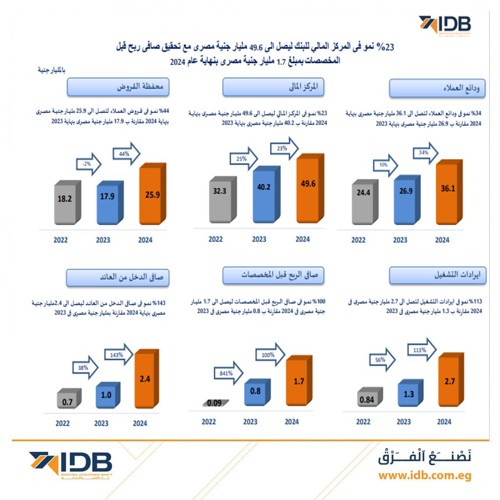 23% نمو في المركز المالي ليصل الى 49.6 مليار جنيه مصري بنهاية 2024 مقارنة ب 40.2 مليار جنيه مصري بنهاية 2023